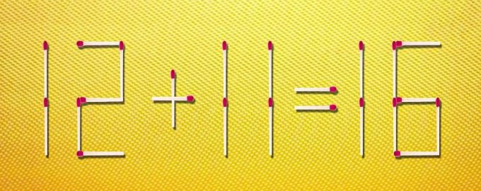 A képen egy hibás matematikai egyenlőség látható 12 + 11 = 16. Ez 23 gyufából áll. Egyikük rossz helyre került. Ha áthelyezzük egy másik helyre, az egyenlőség helyes lesz. A feladatod az, hogy kitaláld, melyik gyufát és hova kell áthelyezni.